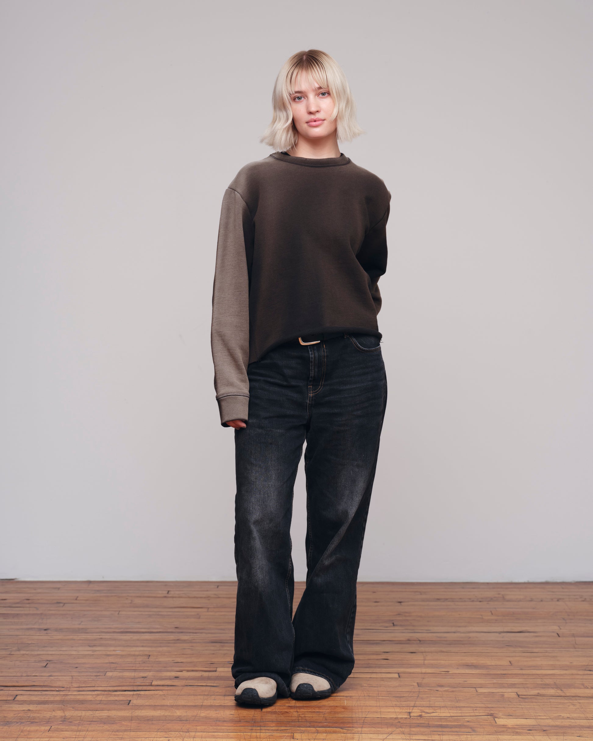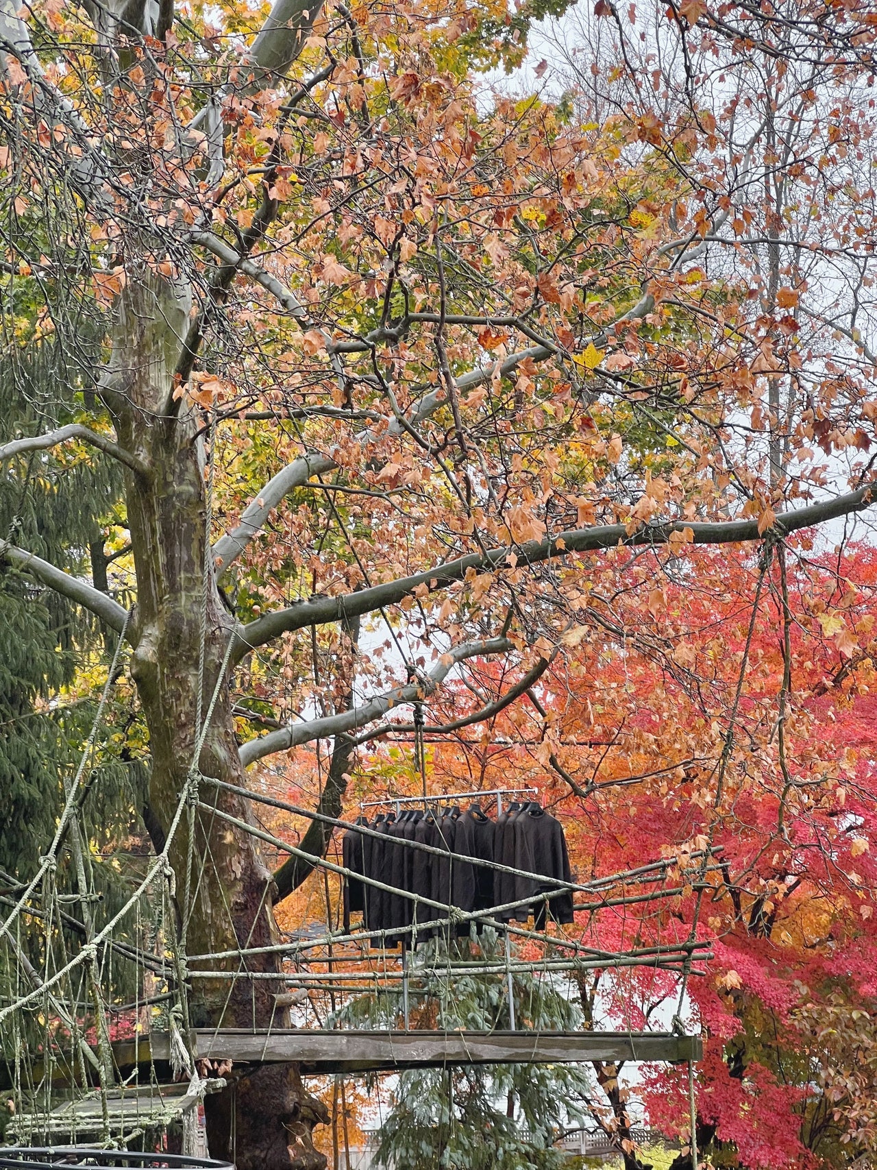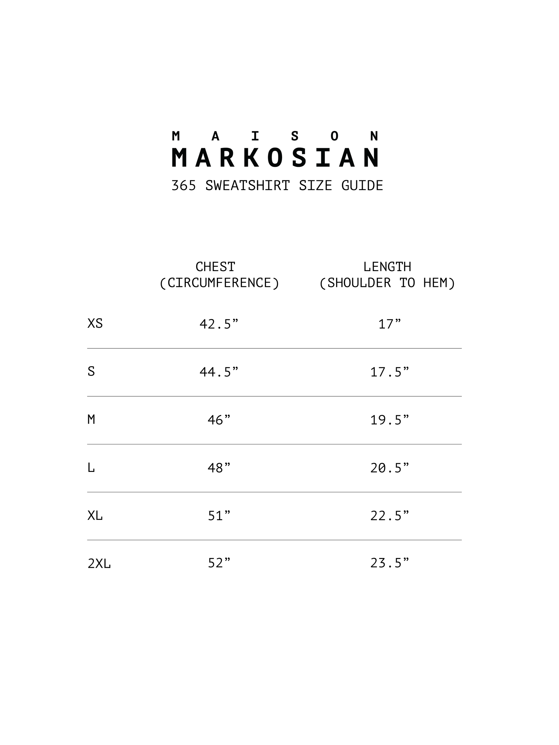 On August 20th, 2024, we installed twelve black sweatshirts on a garment rack in our treehouse. The sweatshirts range in size from XS to 2XL and are made from 400 gsm 80% organic cotton and 20% recycled polyester. These garments are designed to have a cropped, unisex fit and feature a raw bottom hem.