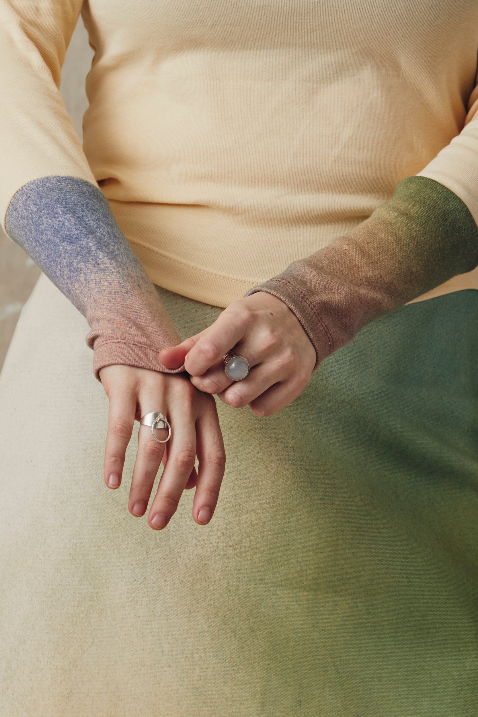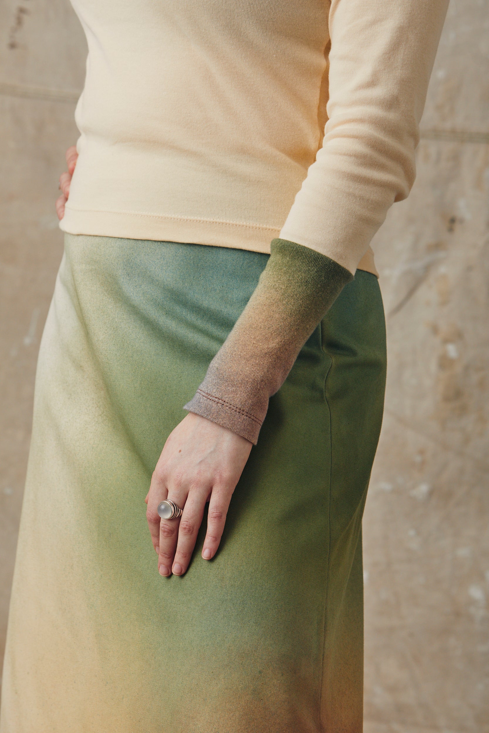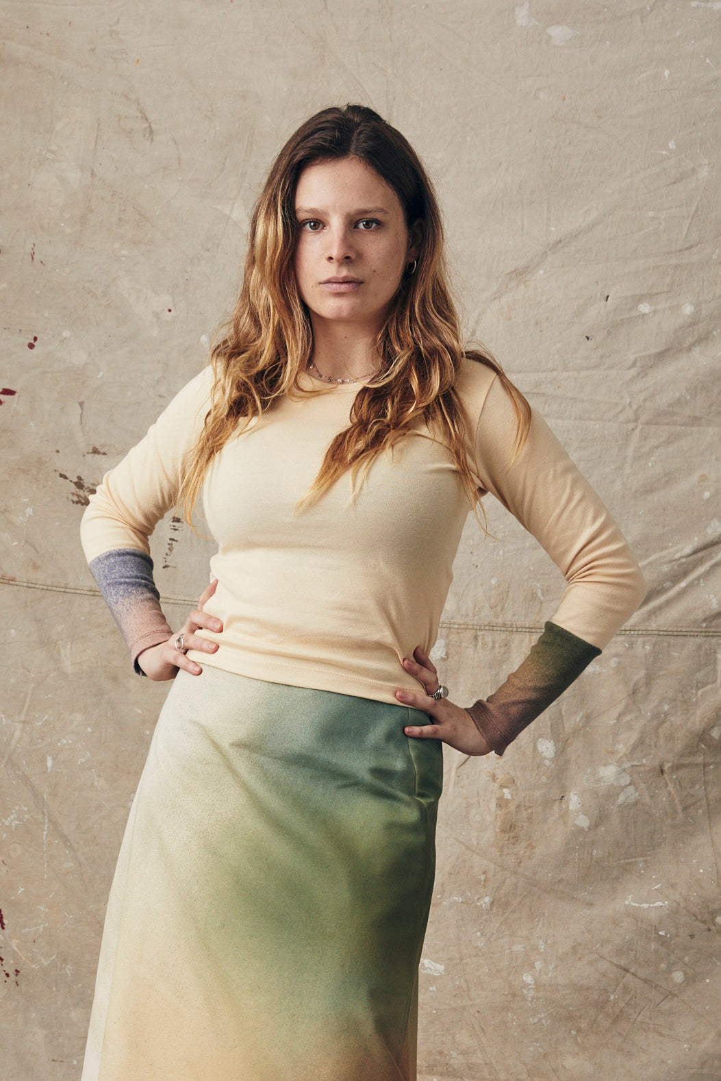 This 100% cotton long sleeve tee features hand-painted statement cuffs in our Ceres Gradient colorway. These garments are sewn and hand-painted in the USA. Each gradient turns out a bit differently, and no two shirts will ever be exactly the same- please expect some subtle differences between the shirt pictured here and the one you receive. This style runs a half size small, so we recommend ordering your usual size if you like a slim fit and ordering one size up if you prefer a looser look. We recommend washing these garments in cool water with like colors and tumble drying them on low heat.