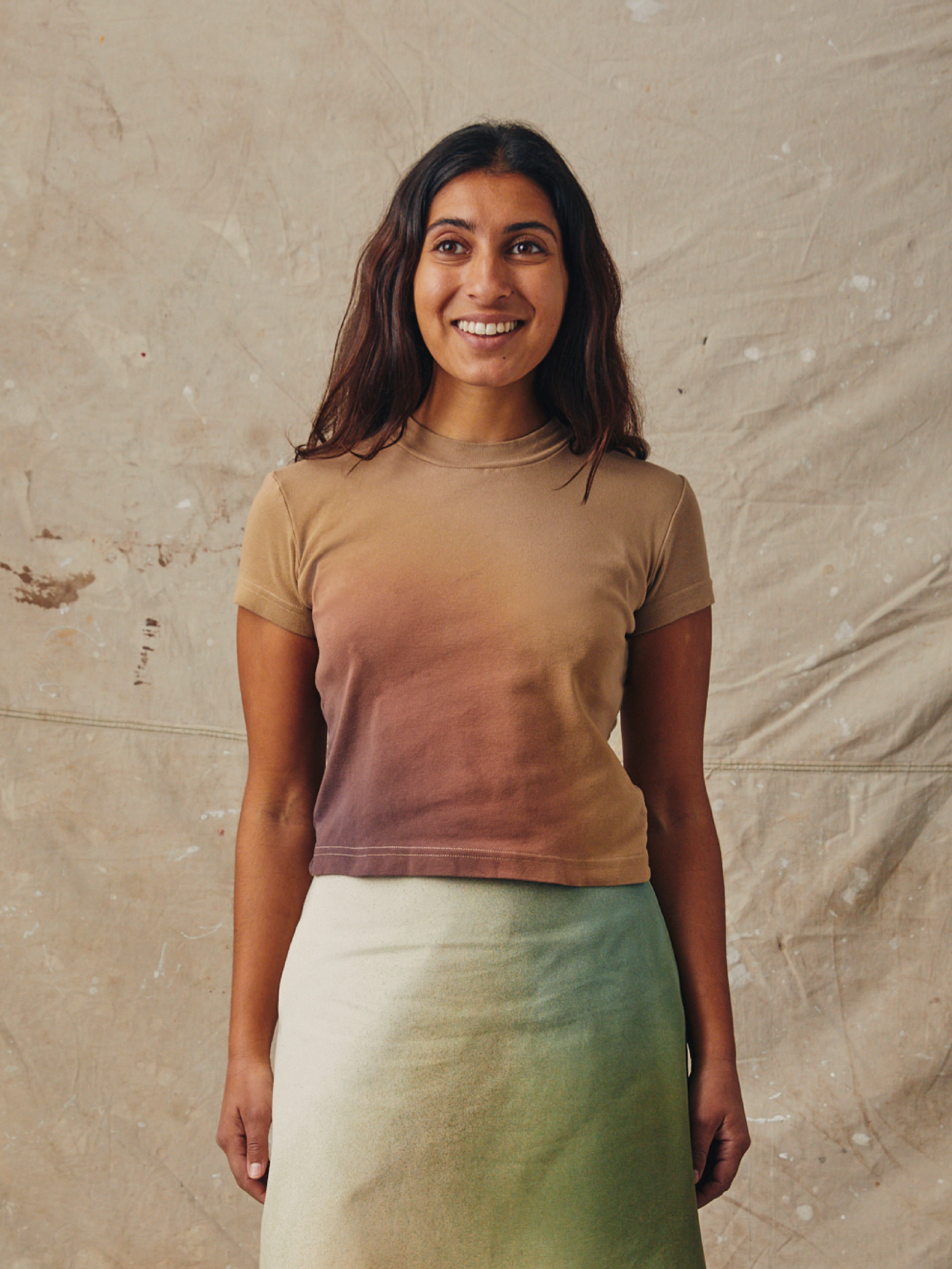The Dune Gradient Mockneck Tee is made from 100% cotton and each of these garments is cut, sewn, and hand-painted (front and back) in the USA. Due to the handmade nature of the graphics on these shirts, please allow for some subtle variation in pattern and color. These tees are designed to fit multiple body types and are only available in one size, so please consult our size chart carefully. We recommend washing these shirts inside out in cool water and tumble drying them on low heat.