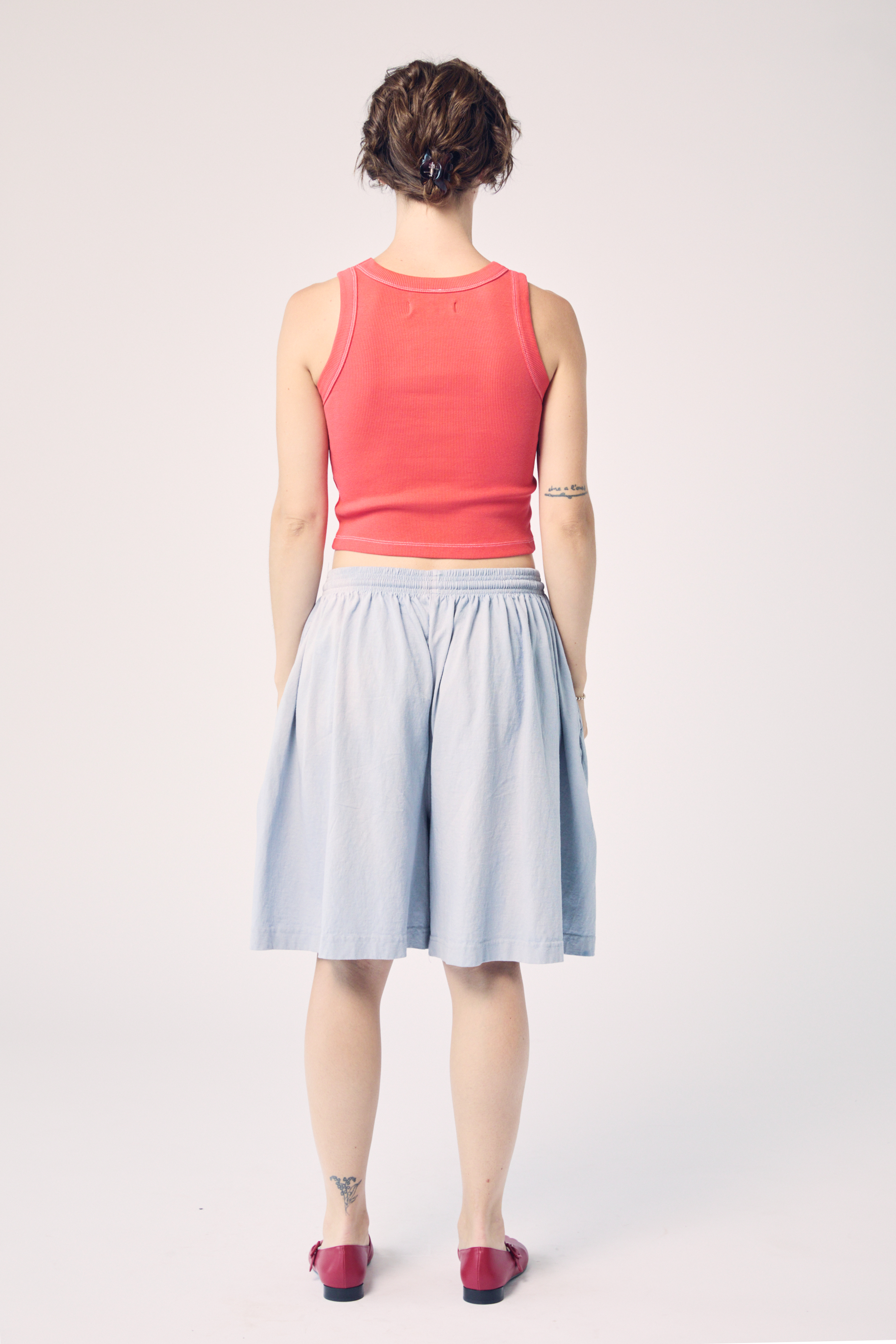 Inspired by the color of the summer morning sky, these one-size-fits-many shorts are garment dyed in a pale grey-blue hue. Due to the hand-dyed nature of these shorts, the final color may vary slightly between dye batches, so please expect some minor variation between the pair pictured here and the pair you receive.