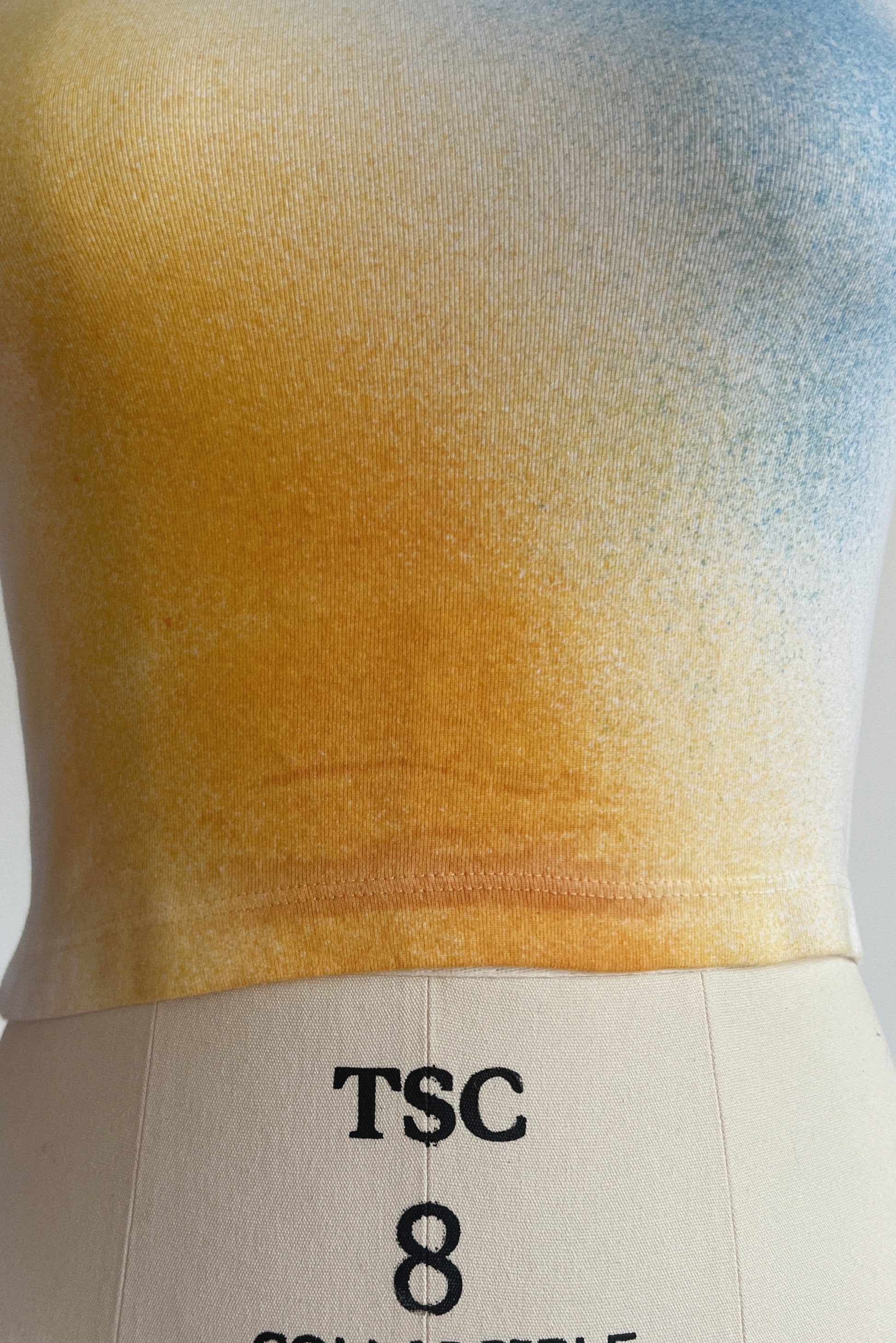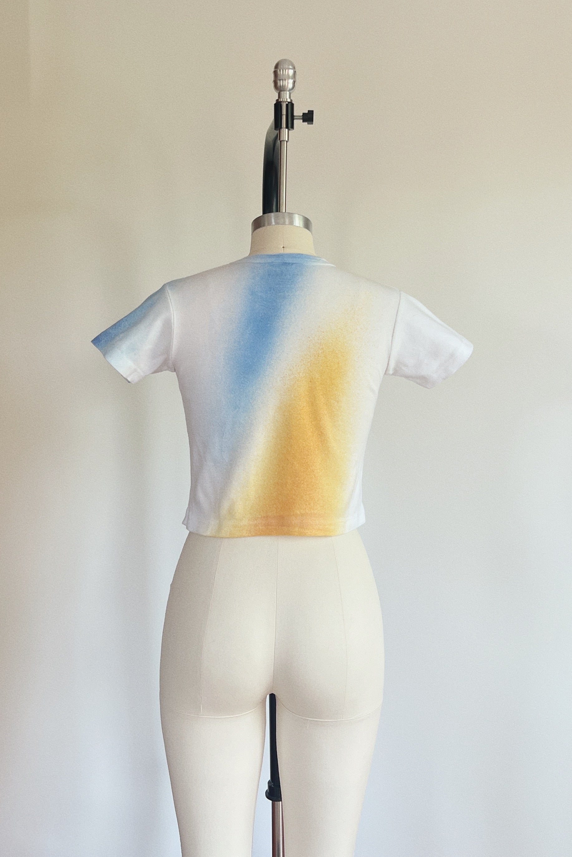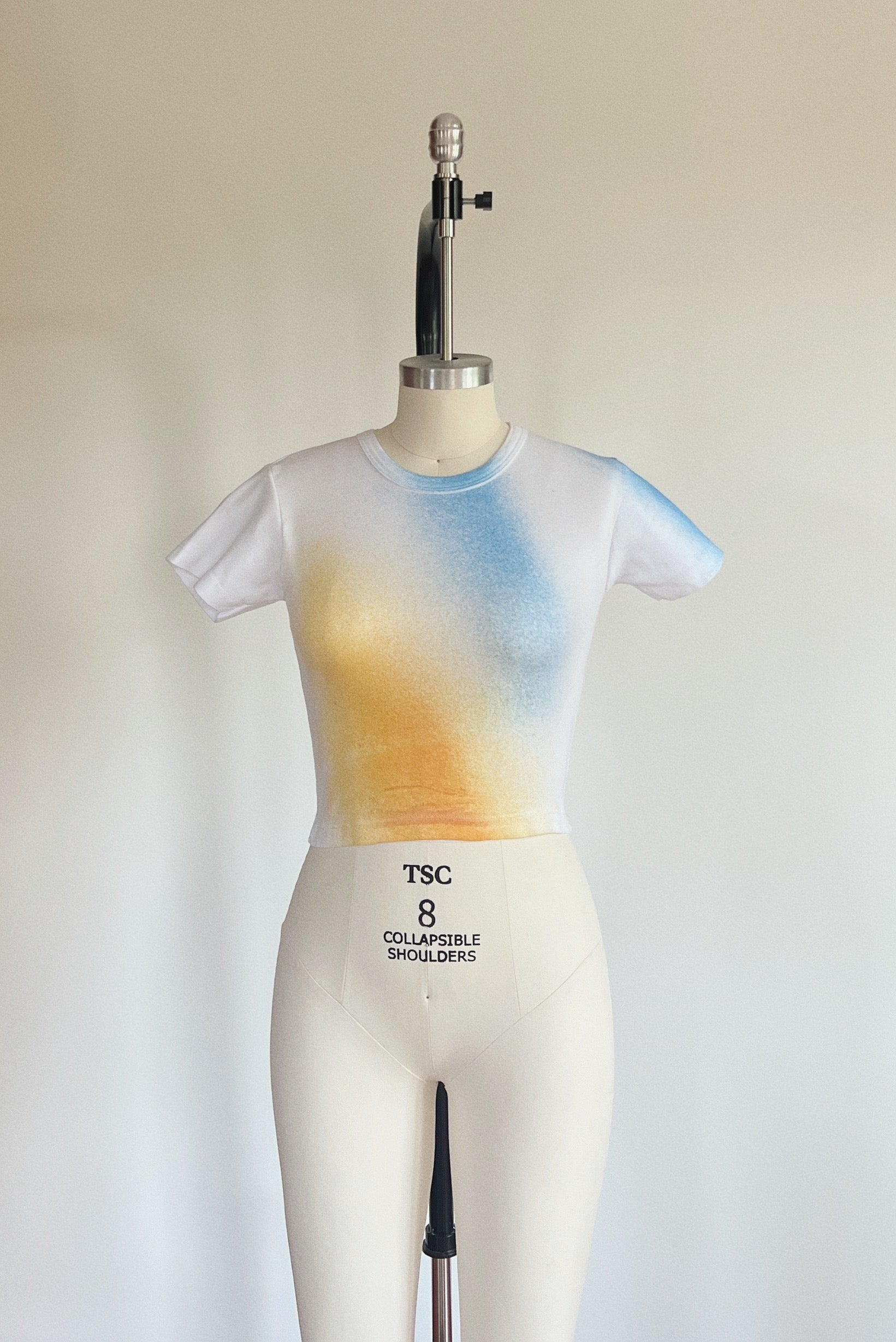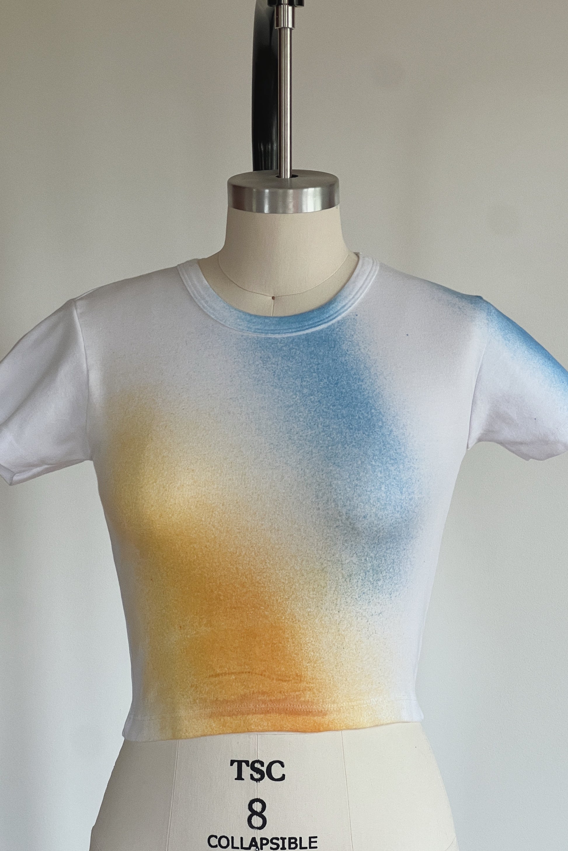 - Laid flat and un-stretched, this shirt measures 14.25" from armpit to armpit. Measured this way, it measures 13.625" across the bottom hem and approximately 15.75" from shoulder to bottom hem.