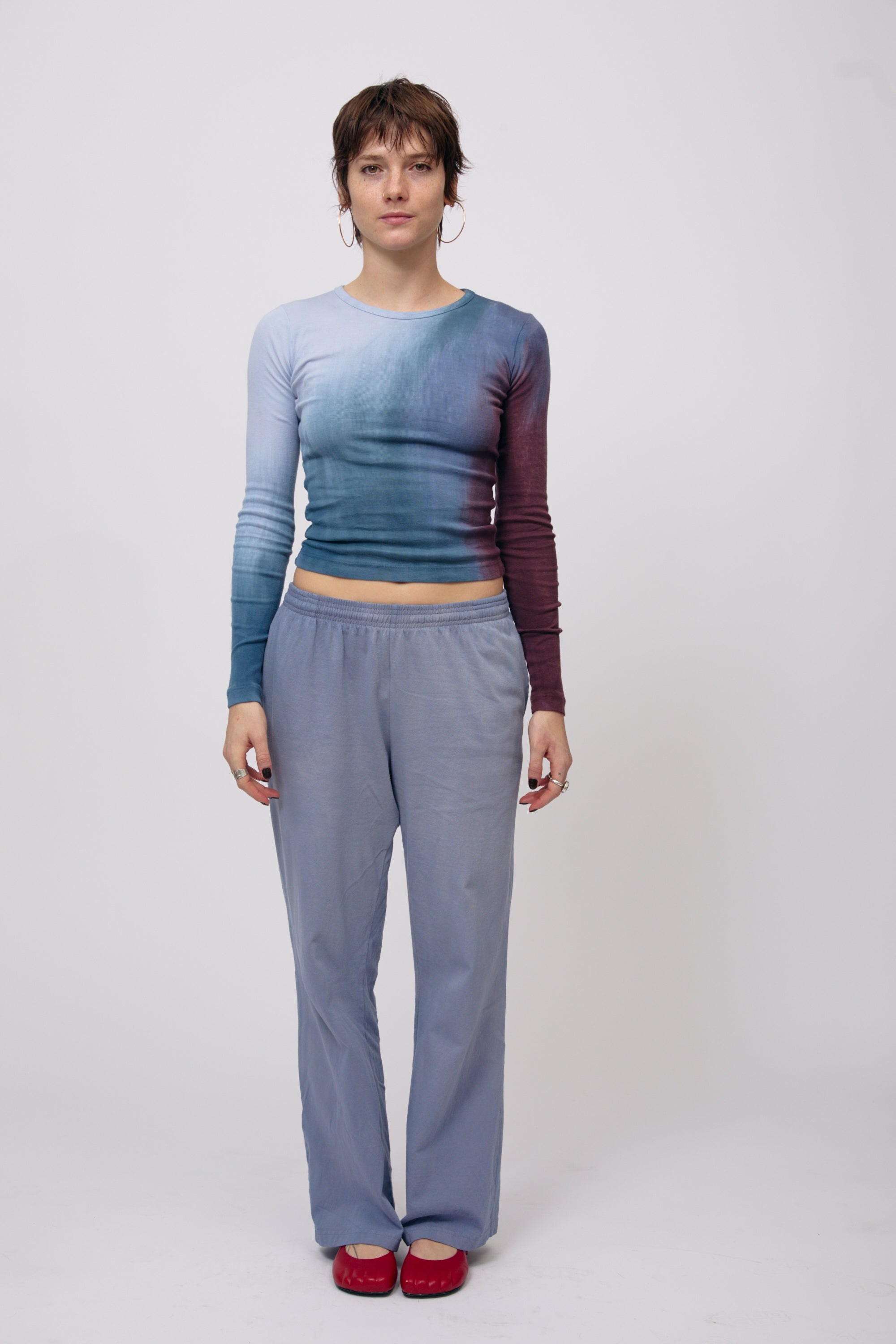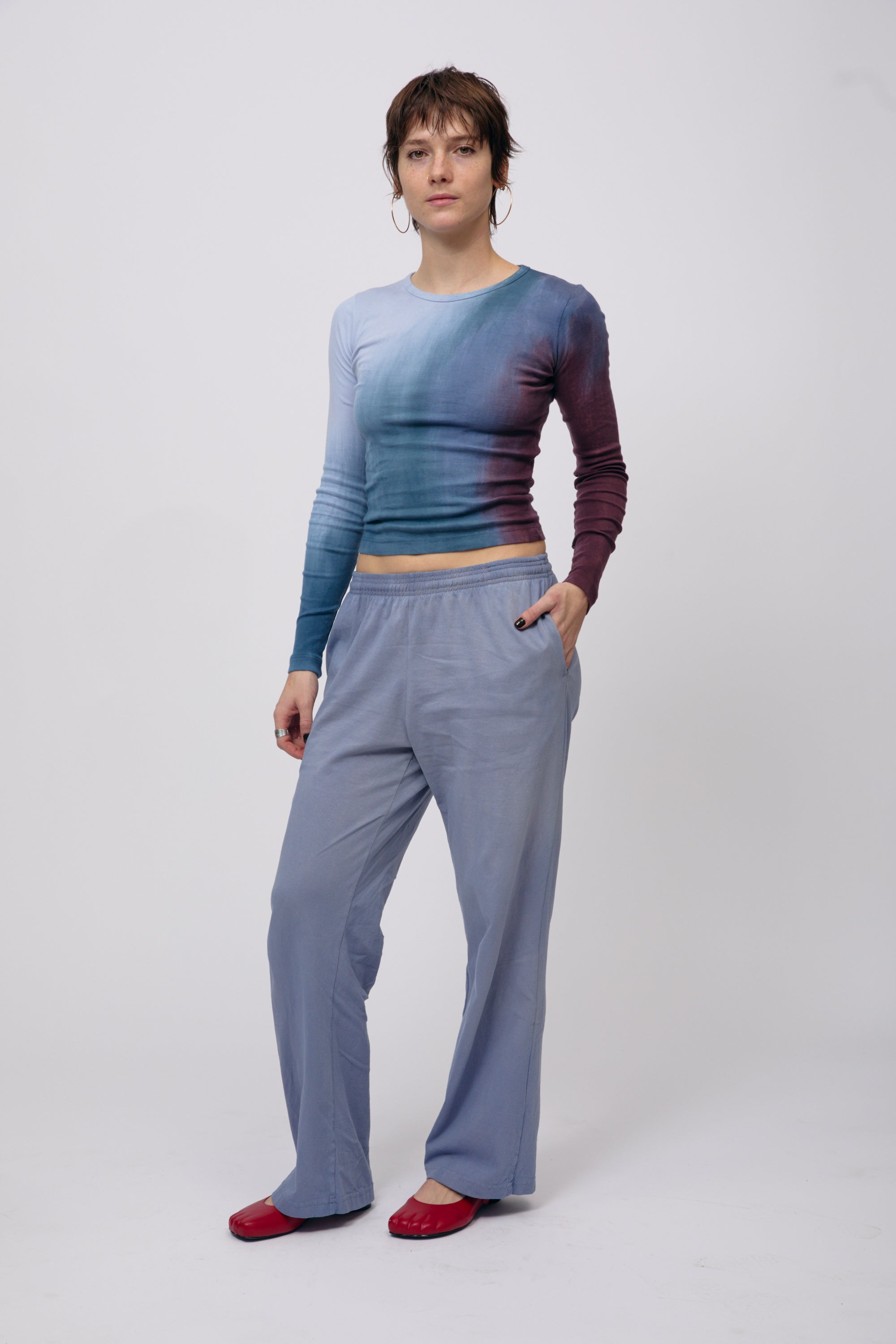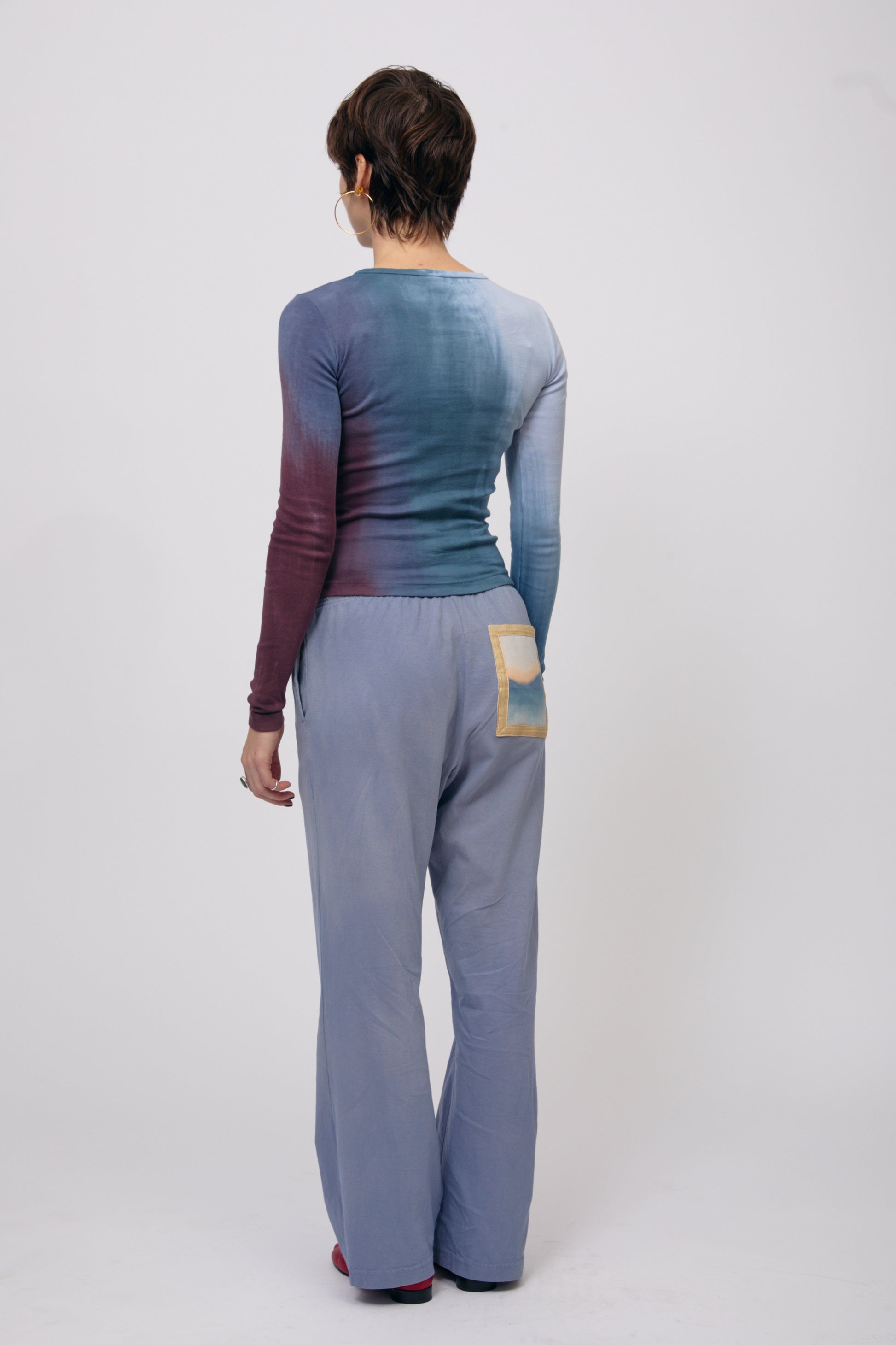 These elastic-waist pants feature a concealed drawstring, two side pockets, and a statement patch pocket on the back. The body of these pants is made from 6.5 oz 100% cotton jersey, and the decorative pockets are made from 100% cotton canvas with a wild silk frame. These pants are cut, sewn, and hand-dyed in the USA. Due to the hand-painted nature of the decorative pocket, no two will ever be exactly the same. Please allow for some subtle variation between the pants pictured here and the pair you receive.