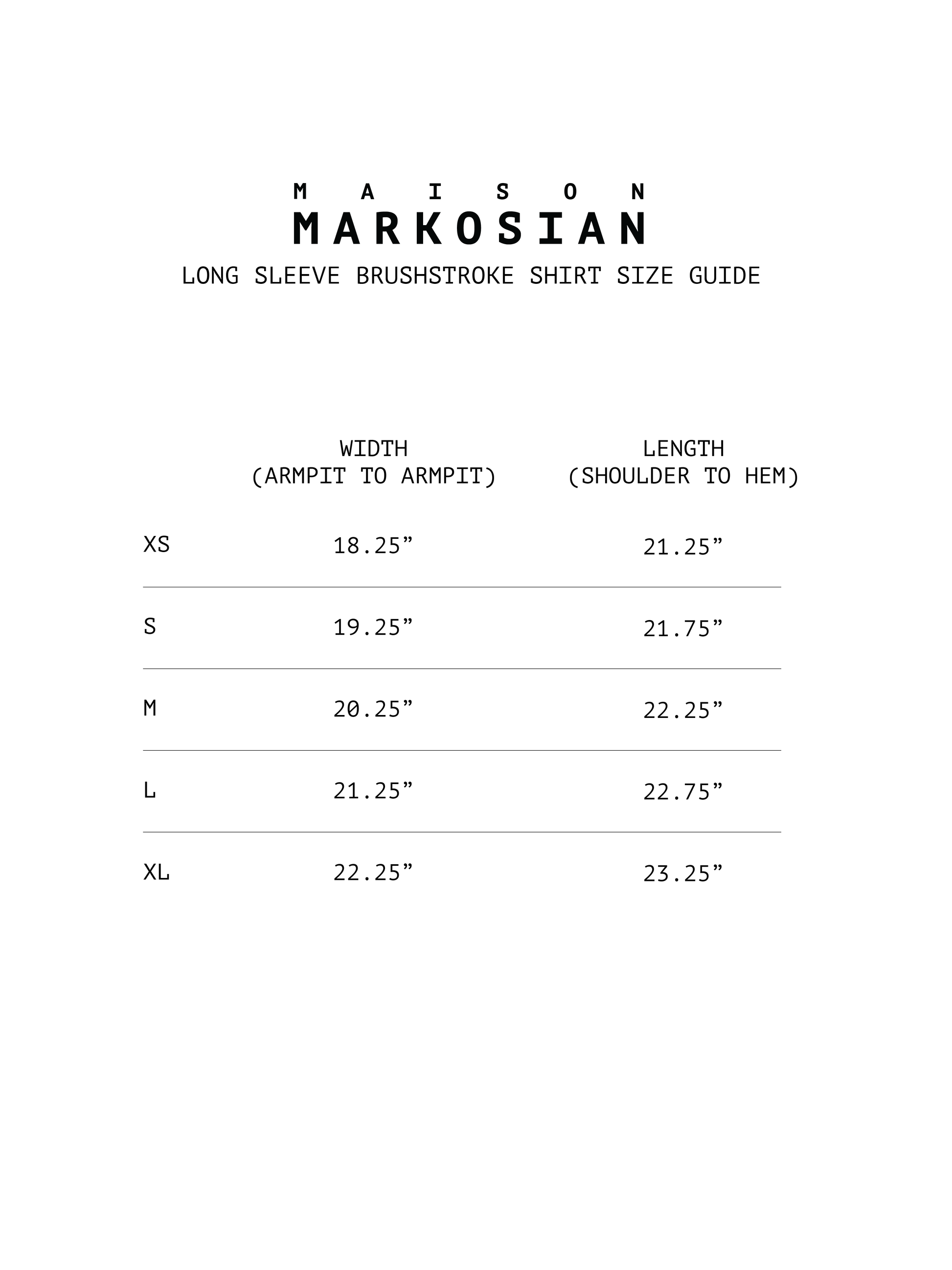 Due to the handmade nature of these garments, each one comes out a little differently, so please allow for some subtle variation between the shirt pictured here and the one you receive. These shirts are 100% cotton and are cut, sewn, and hand-painted in the USA. We recommend washing them in cool water with like colors and tumble drying them on low heat. Please do not bleach or dry clean them. For sizing guidance, please consult the size guide included in the image carousel.