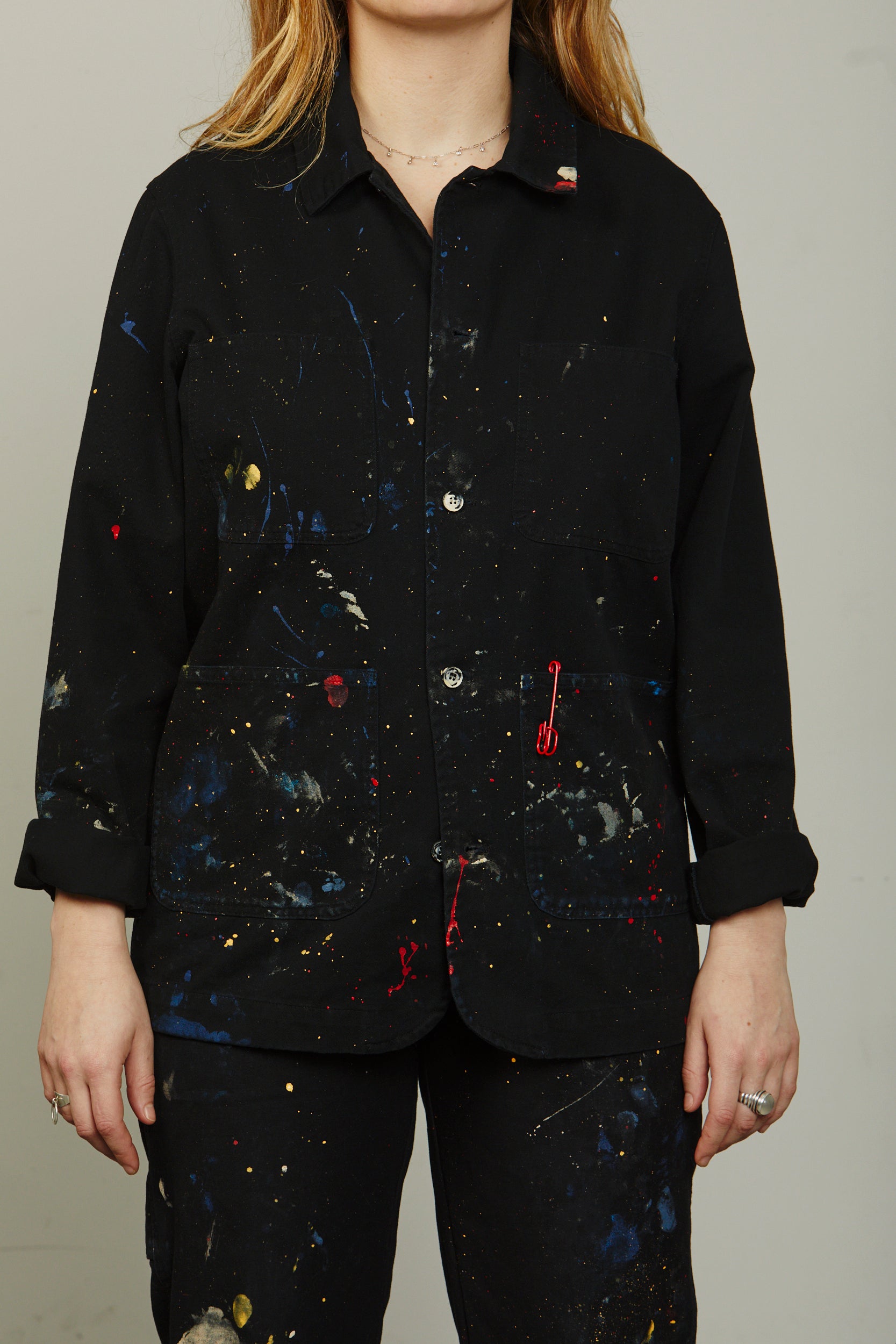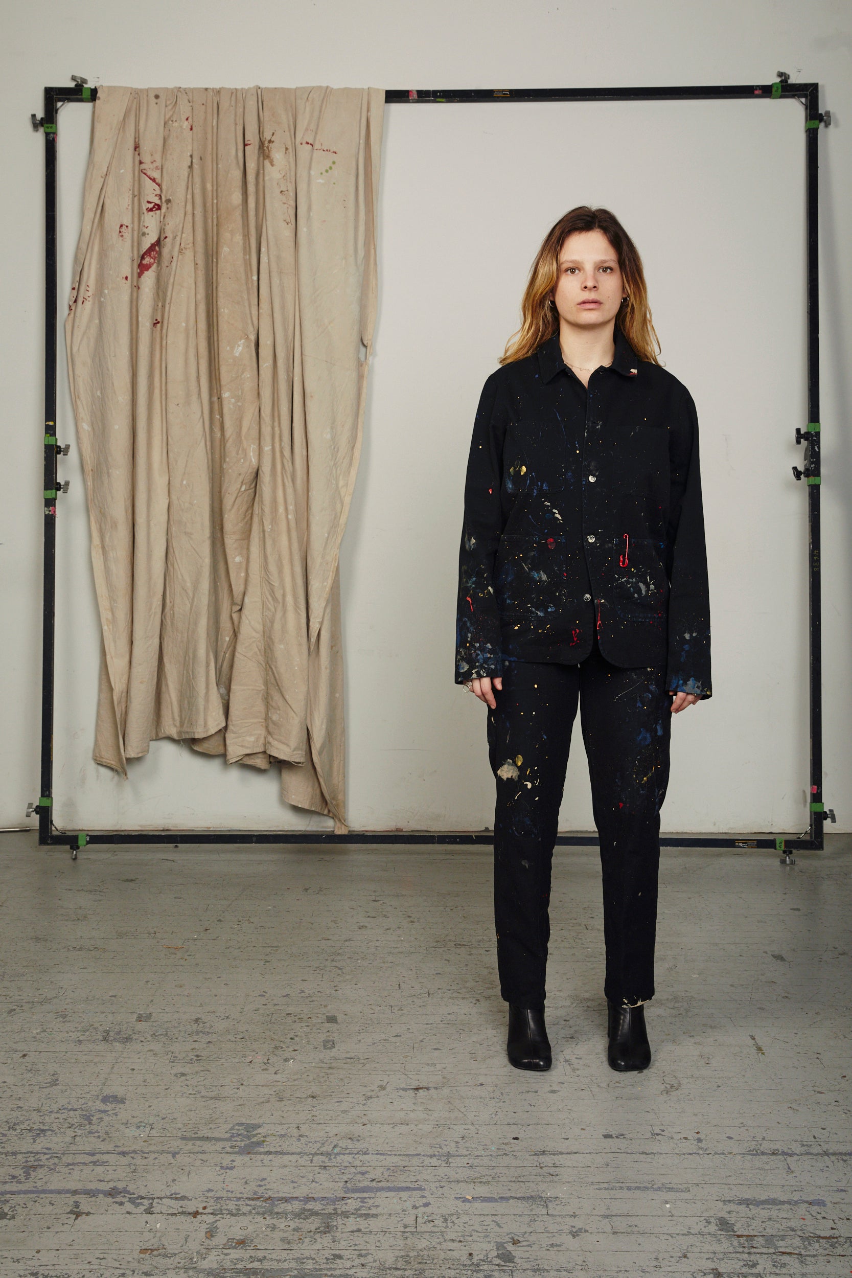 Inspired by the workwear of professional painters, the Scenic Artist Chore Jacket is cut in a classic, gender-inclusive style. This jacket was designed to emulate the natural patina of clothing worn in a painter's workshop for decades on end. Each garment is hand-painted using tools and techniques commonly used by scenic artists.