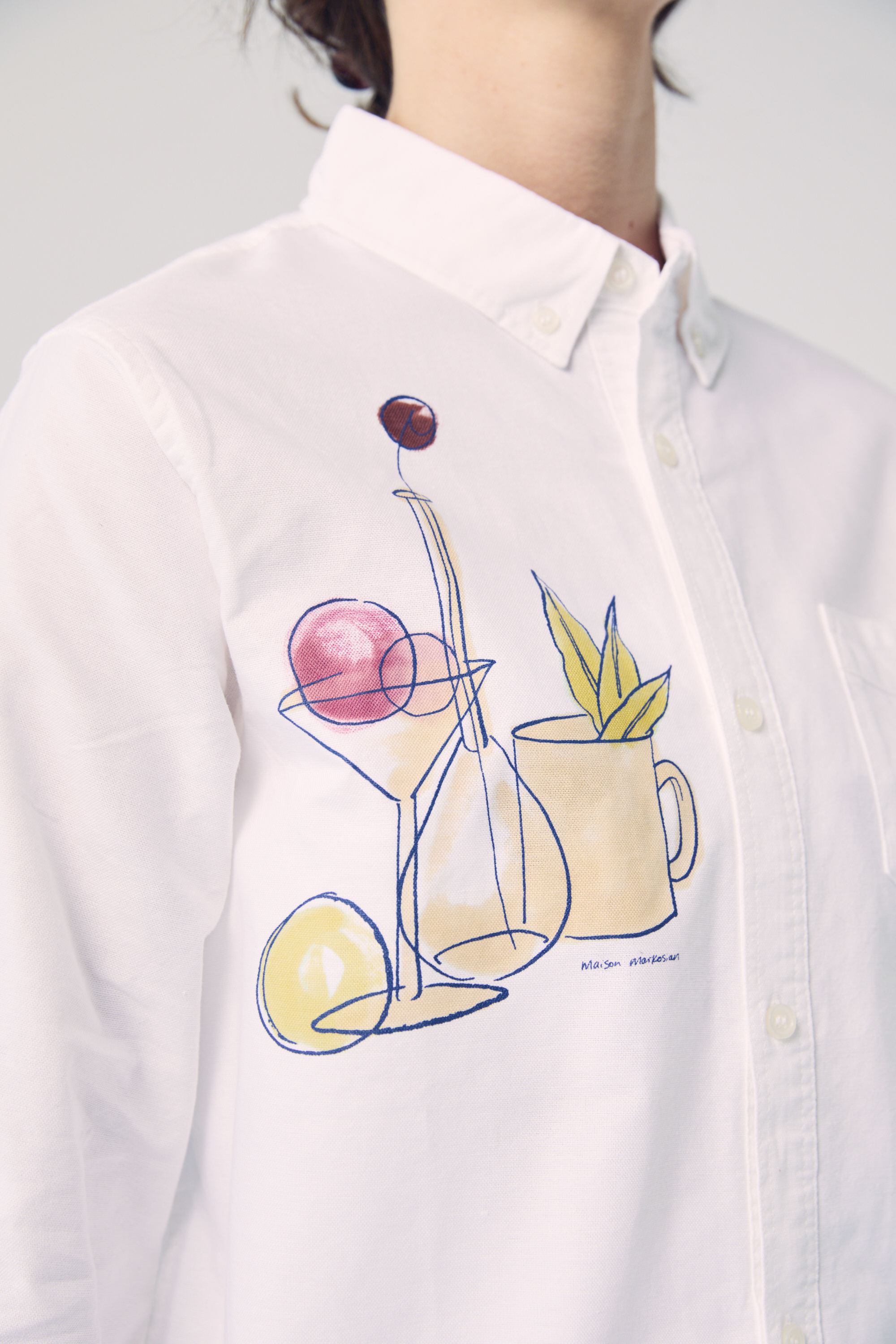 Paying homage to a quintessential style of painting, the Still-Life Button Up features a graphic depicting classic still-life subjects. Blending multiple techniques, we work with a local printer to screen-print the navy blue line art on this shirt before hand-painting the colorful brushstrokes with our custom-mixed dyes.